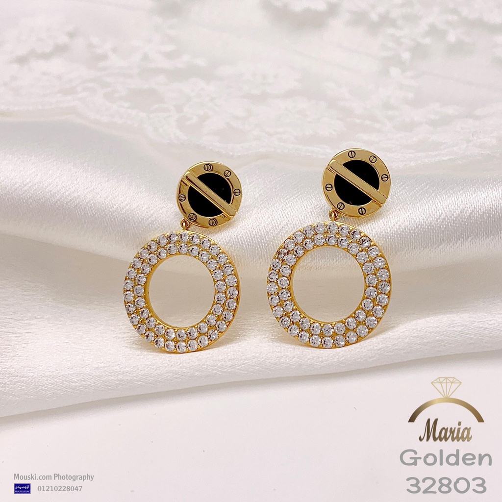 32803 حلق لوكس ماركة ماريا عمود فضه بريمه جولد حلقه مينا اسود فصوص مايكرو زيركون
