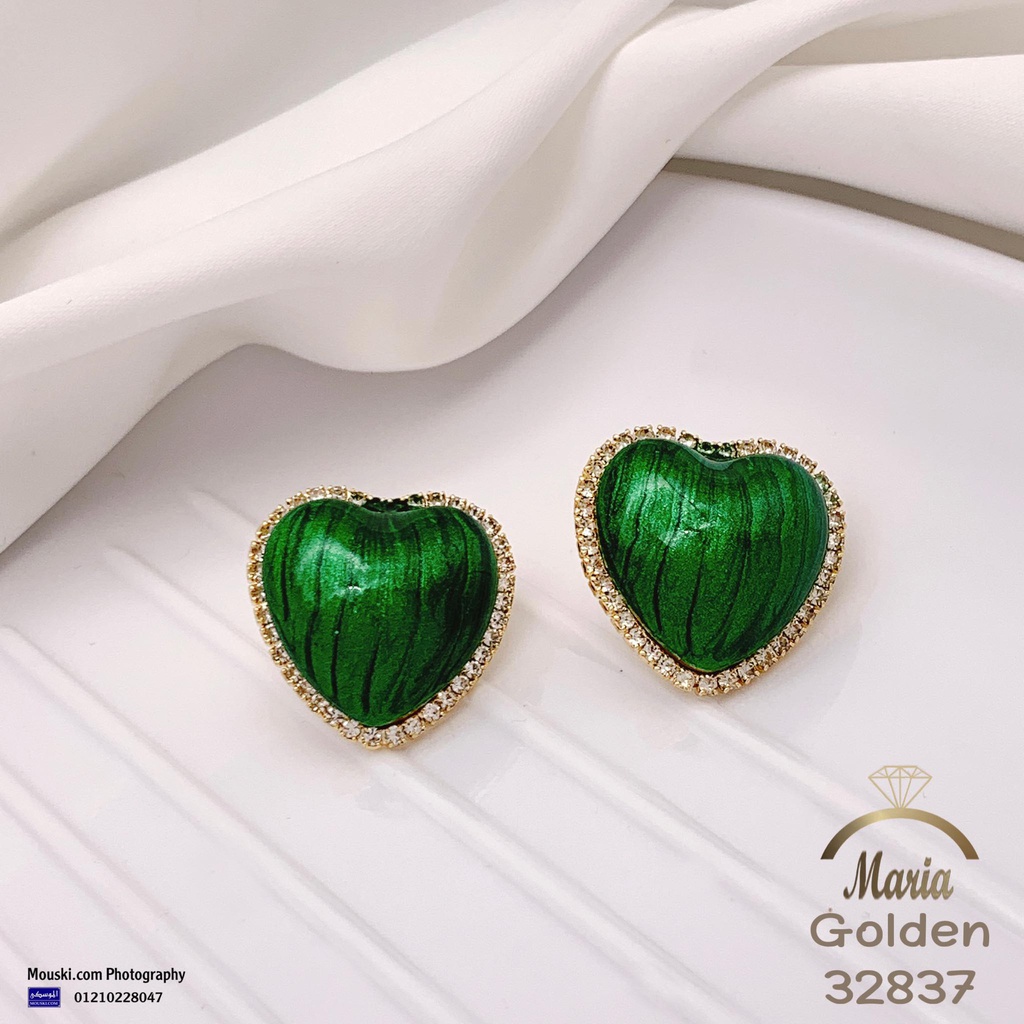 32837 حلق لوكس ماركة ماريا عمود فضه بريمه جولد قلب اخضر فصوص مايكرو