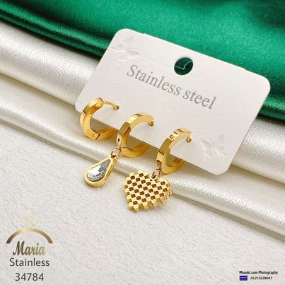 34784 طقم حلق 3 قطع ستنالس جولد بريمة عيار 316 قلب و دمعة