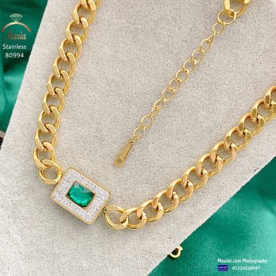 80994 كوليه جولد ستانلس عيار 316 فص باجت اخضر و فصوص كريستال سلسلة جرومت